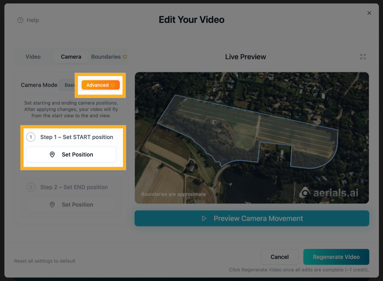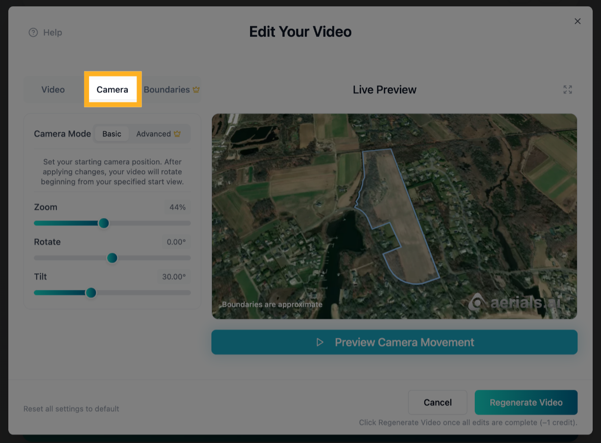 In the “Advanced” camera tab, you can set fully custom starting and ending camera angles. After regenerating your video, it will fly from the start position to the end position.