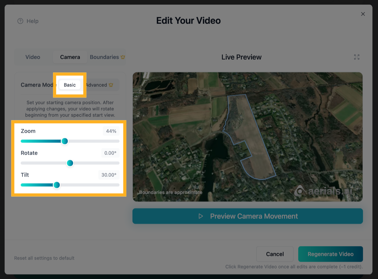 In the “Basic” camera tab, you can click and slide the sliders on the “Zoom”, “Rotate”, and “Tilt” rows to adjust the starting camera angle for your video.